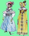 Вторая дама одета в несколько более новом стиле. Линия плеч опущена, а талия, отмеченная кушаком из ленты, вернулась на свое естественное место. Рукава выполнены в стиле "gigot" "баранья нога". Лиф ("canazou") сделан из гофрированного тюля. Широкая юбка оставляет щиколотку полностью открытой. Широкие поля шляпы-капора украшены цветами и летами.