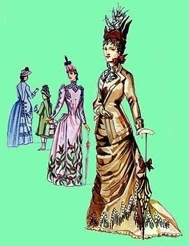 Дама на переднем плане одета в выдержанный в строгом стиле жакет и такую же юбку. Жакет с широким воротником и отворотами обрисовывает фигуру, особенно в бедрах. Узкие рукава завершаются у запястий отложными манжетами. Вокруг шеи повязан кружевной воротничок со свисающими концами, застегнутый посередине брошью. Юбка с небольшим шлейфом уложена в поперечные складки, подобрана с боков и отделана бахромой. Волнистые волосы дамы с небольшой челкой расчесаны на прямой пробор; волосы с боков собраны в стиле "Cadogan", так что видны уши. " Ток" (шляпка) дамы украшен высоко поднятыми белыми голубиными крыльями и цветами. В руках у нее перчатки и зонтик.