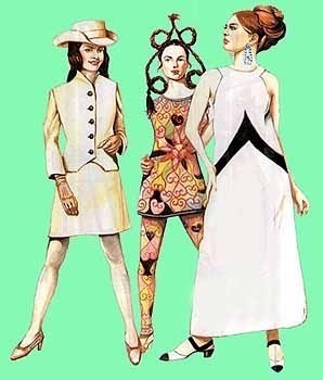 В центре итальянская модель того времени, созданная Эмилио Пуччи; модель достопримечательна набивной тканью, из которой она сшита. Этот чисто итальянский cтиль характеризуется обтягивающим фигуру мини-платьем или туникой с короткими рукавами и брюками в обтяжку из такой же ткани. Необыкновенная, фантастическая прическа создана из естественных волос и искусственных кос.