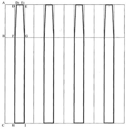 Построение задней половинки Строим прямой угол из точки А. АВ = высота линии бедер (Вб) (Пример: 18 см.) АС = длина сидения (Дс ), (Пример: 26 см.) AD = длина юбки-брюк (Ди ). (Пример: 75 см.) BF = (обхват бедер + прибавка) / 4. (Пример: Подробнее...